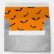 Cute smoky grey Halloween envelope with black bats outlined in white flying on an orange background inside flap.