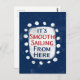 Bold text reading "Smooth Sailing From Here" is centred against a navy blue background. The red and blue text sits on a white rectangle with large textured white dots around it, providing a playful contrast against the solid colour backdrop.