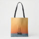 A relaxing and zen tote bag featuring a sailboat (vessel) sailing on the sea during sunset.