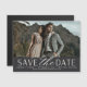 A modern save the date magnet designed to accommodate a single horizontal or landscape oriented engagement photo. "Save the date" appears beneath in chic block and script lettering, with your names, wedding date and wedding location beneath, along with your wedding website or additional details.