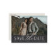 A modern save the date postcard designed to accommodate your favourite horizontal or landscape oriented engagement photo. "Save the date" appears beneath your photo in white block and script lettering, with your names, wedding date and wedding location beneath. Postcards reverse to show additional save the date details, including your wedding website, with your return address and space for recipient addressing.