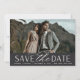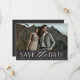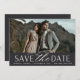 A modern save the date card designed to accommodate your favourite horizontal or landscape oriented full-bleed engagement photo. "Save the date" appears beneath your photo in chic block and script lettering, along with your names, wedding date and wedding location. Cards reverse to reveal additional save the date details.