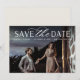 A modern save the date card designed to accommodate your favourite horizontal or landscape oriented full-bleed engagement photo. "Save the date" appears at the top of your photo in white block and script lettering, with your names, wedding date and wedding location beneath. Cards reverse to show additional save the date details.