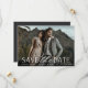 A modern save the date card designed to accommodate your favourite horizontal or landscape oriented full-bleed engagement photo. "Save the date" appears near the bottom of your photo in white block and script lettering, with your names, wedding date and wedding location beneath. Postcards reverse to show additional save the date details.