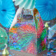 Smooth spiral in brightly coloured patches overlapping and causing a slight puffing effect resembling the shape of an open flower.