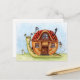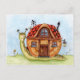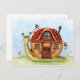 Cute fun watercolor painting of a comical snail carrying his house on his back. His shell has three little windows and a wooden door. A red slate roof with a black chimney and a weather vane. This funny snail is ideal for a gift for any child.