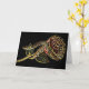 Ball Python Snake Greeting Card. Snake coiled around a red rose of gold trim on black background.