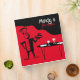Retro style Snappy Chef comes out of the kitchen with a chef's special, ready to serve it up to one lucky patron. Recipe cookbook notebook binder with all white chef with groovy spiral hands, feet, and face with chef's hat and jacket on a black background with deep grey and red irregular stripes.