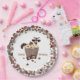 Framing the scene is a delightful chocolate chip border in rich, varied shades of brown, giving the plate a sweet, treat-inspired finish. The soft monochrome tones of the raccoon contrast beautifully with the warm chocolate accents, creating a balanced and gender neutral birthday plate perfect for boys and girls alike.