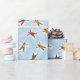 This wrapping paper features a watercolor portrait of people making snow angels.