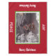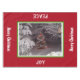 Festive wintry scene with heavily snow covered trees and trees branches on a winter's night. A brightly lit Christmas tree sits in the distance all aglow inside the green white centre frame. Merry Christmas is written along both ends in snow-capped white text lettering. Peace and Joy are written in white text long sides of small size. Original Photography and Design © TamiraZDesigns.
