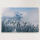 20"x30" puzzle with a beautiful photo of snow-covered mountains and pine trees.