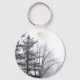 In the horizontal black and white photo of snow-covered trees, two evergreens on the left edge of the frame overlook several shorter barren deciduous trees, all covered with snow. The sky above them is white.