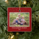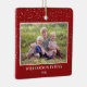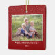 This square Christmas ornament features a horizontal photo on a red background accented with small dots to represent snow. Personalize this family ornament with your name and year.