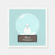 Very cute artwork of a snowman in a snow globe, on aqua and decorative text that says merry Christmas.