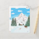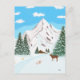 A card with a wonderful scene of snowy mountains, snow covered evergreens and a male deer looking down at a rustic cabin. Original artwork by W.B. The image, background and text can be personalized.