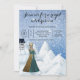 A beautiful illustration of a princess or queen standing in a clearing in the snow with snow covered mountains; soft falling snowflakes and a castle in the background. She has long luscious hair and is wearing a regal dark aqua blue and faux gold ball gown with a gold crown. The back has templates to add additional information at no extra charge.