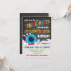 Super fun Snow Tubing Birthday Party with falling snow, a big blue tube and fun fonts on a chalkboard background. Great for a girl or boy. Hand drawn illustration by McBooboo.