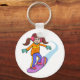 A girl snowboarding down a slope. This design looks really effective on these Keychain