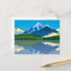 Postcard in a digital painting of snow-capped mountains and pine forest, reflected in a lake, under a deep blue sky