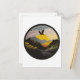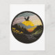 A sticker with an eagle flying over a mountain, in the style of contemporary landscape, golden light, black mountain college, fisheye lens, arts and crafts movement, mid-century illustration