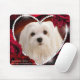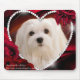 A dramatic image of Snowdrop a sweet little Maltese.   The pictures consists of a deep red silk background on  top of which sits a diamond heart with a photograph of Snowdrop embellished by some lovely red roses.