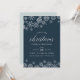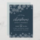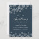 Elegant Christmas dinner or holiday party invitations feature a top and bottom border of falling snowflakes on a rich marine blue background. Personalize with your Christmas celebration details (shown with "Christmas dinner and merriment") in white lettering.