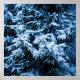 Snowfall in the forest. Snowflakes in the air. Snow covered Christmas tree. Blue and green colours, winter mood. Merry Christmas and Happy New Year to you and yours!