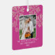 Personalize this double sided 2 photo Christmas ornament with your text and photos integrated into the elegant dark pink and pink faux glitter snowflake design. Both sides are identical in layout, with five faux sparkle pink snowflakes at the top scattered behind a square photo template with rounded corners and framed in white on a deep berry pink background. Up to 3 lines of text at the bottom in a simple white font lets you title each picture separately or simply express a holiday message and the year on each square metal ornament. Upload two of your photos, one on each side, or use the same picture on each side, as you like. Designed to be customized just how you want, these rich deep raspberry pink and snowflake photo Christmas ornaments are great keepsakes for your own holiday tree or as personalized gifts for family and friends.