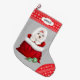 An adorable little white Shih Tzu dog pops out of a red gift bag on the front of this Christmas stocking. A few teal and gold pattern Holiday tree bulbs lay just in front of the Santa bag The image is placed on a white background, and the toe and top border are a red and white snowflake pattern. On the top border is a white label with your custom text in dark grey. The back of the stocking has the same red and white snowflake pattern.