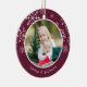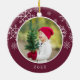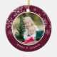Festive photo Christmas ornament features a favourite photo on each side, framed by white snowflakes on vibrant jewel toned burgundy plum. Personalize with a custom caption on each side; shown with names and the year.