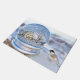 Inside a snow globe is a winter landscape with a cottage overshadowed by bare maple and cherry trees. Snow glitters on the lawn, holly bushes covered with bright red berries flank the door, and snowflakes tumble through the frozen air. Beside the globe a little chickadee looks curiously in at the miniature scene.