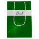 Green personalized gift bag with a shimmering snowflake (digitally created and does not actually shimmer).