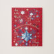 Snowflake greetings in red, blue and whites. May you have cozy and warm holiday time! Cheers!