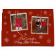 Super cute, large Christmas gift bag has a textured red background paper and 2 frames for a few of your favourite family photos. Cute white snowflakes are scattered about. The bottom says "Have Yourself a Merry Little Chrstmas, which can be changed to anything you like to personalize it for your family. The reverse side of the bag says "With Love From Our Family To Yours" (which can also be changed) and a place for your names. Other sizes are available in the shop.