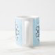 Snowflake mandala mug featuring abstract art with a beautiful hairy snowflake in cobalt and cerulean blue shades over textured light blue background.