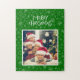 Snowflake Pattern on Green Merry Christmas Photo Jigsaw Puzzle