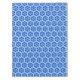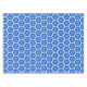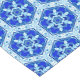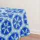 Tablecloth in a geometric, honeycomb quilt pattern of snowflakes in deep cobalt blue and white, accented with turquoise