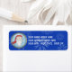 Holiday return address labels with a Santa Claus and blue background with snowflakes and white text that's easy to customize.