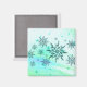 Blue and silver snowflakes riding on a teal and blue swirly winter breeze. Set on a white background. Fun and delicate design.