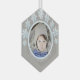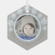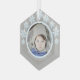 Design these unique custom photo glass ornaments, printed just for you, and create treasured Christmas keepsakes for your friends and family. The chic faux white opal snowflake design features your photo turned into a round image framed with a faux white opal border, set on a background of warm dove grey. Just add your photo using the easy template and watch it become part of this stylish white opal snowflake design. Personalize this unique hexagon glass ornament with your custom text at the bottom in a pale grey font which is balanced by the nine tiny faux white opal snowflakes drifting down across the top of each ornament. Personalized ornaments are a lovely way to commemorate baby's first Christmas, your first holiday as a married couple or as a cute way to display photographs of family vacations or pets. Customize these unique faux white opal snowflakes Christmas ornaments with your treasured photos and make your own personalized gifts that are sure to bring smiles to everyone.