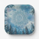 These paper plates feature a Snow-laden pine forest frames an intricate frost-mandala snowflake in a soft blue winter sky - a serene, symmetrical symbol of nature's calm and unity. Finished in a soft whimsical oil paint art print.