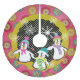 Snowflakes and Orbs Penguins holiday tree skirt features three cute penguins in winter hats and scarves on a background of hot pink with snowflake orbs, a strip solid mustard, and a back centre with white polka dots and snowflakes!