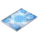 A lacy blue design reminiscent of snowflakes in a frosty window.