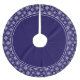 A dark blue tree skirt with a seamless pattern of snowflakes in different shapes and sizes. The pattern surrounds the edges framed in of a double lined border. This tree skirt has the same snowflakes on dark blue design as a theme in this collection.