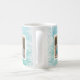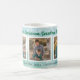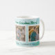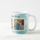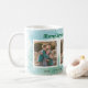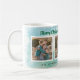 This photo mug features three square photo frames on a winter snowflake teal background. Custom text above and below the photos allow you to personalize with a holiday greeting and names. Photography © Storytree Studios, Stanford, CA