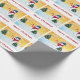 Cute snowman Christmas holiday wrapping paper for kids with Merry Christmas wish. The design features cute snowman with blue hat and red scarf, with candy cane in his hand. Christmas trees have yellow stars.