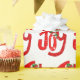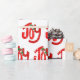 Snowman and joy red text in fun font style on white with snowflakes.
