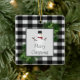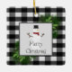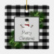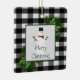 Décorez votre arbre cette saison de vacances avec un ornement en céramique de Buffalo Snowman. La décoration ornementale comprend une boîte ornée de branches de pin et d'un charmant bonhomme de neige contre un arrière - plan en plaid de buffle noir et blanc. Autres cadeaux et objets de vacances disponibles avec ce design aussi.