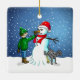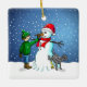 The boy has built a snowman that his dog stands and urinates on while the boy gives the snowman a carrot nose.